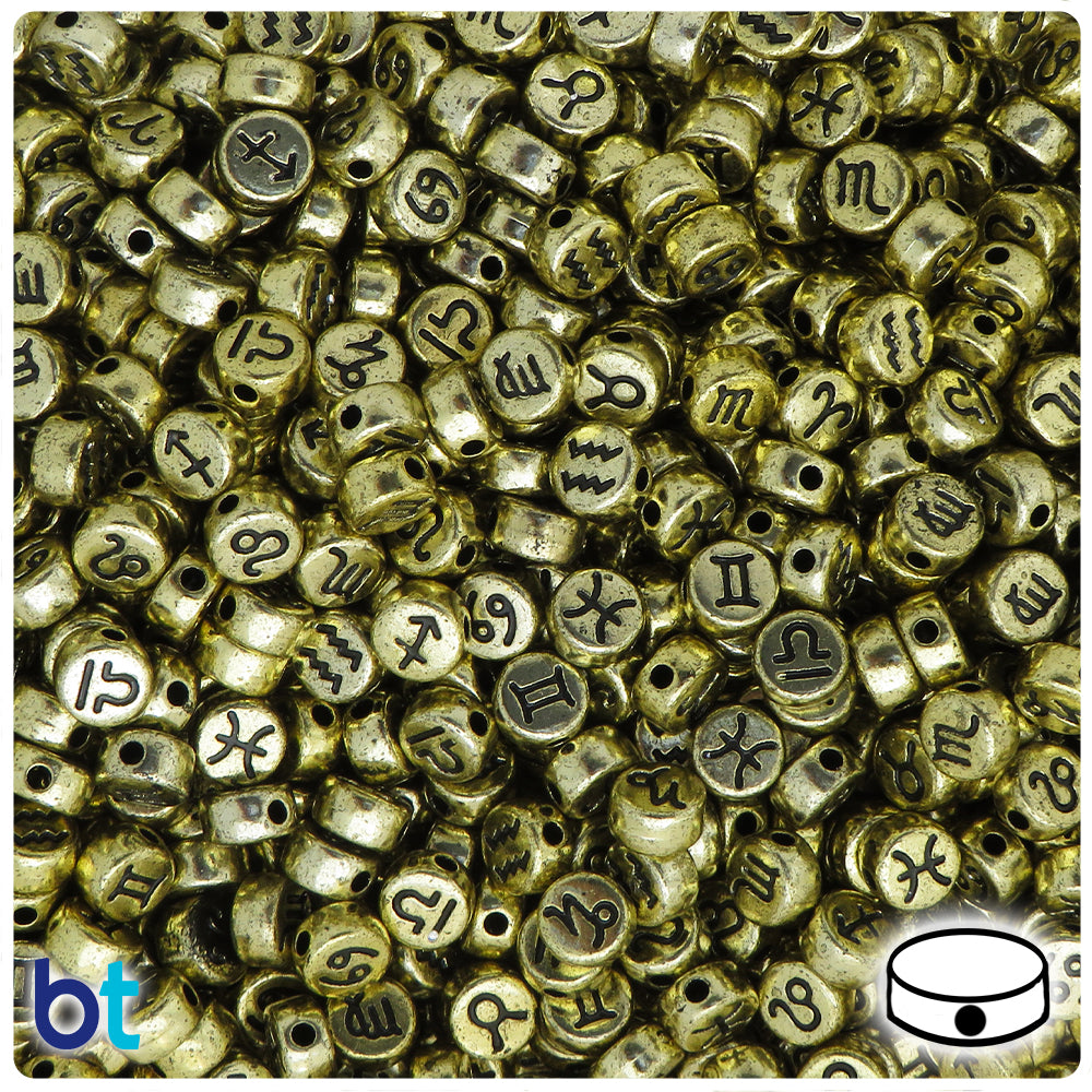 These gold metallic finish coin shaped alphabet plastic beads measure 6.8mm diameter by 4mm thick and have a 1mm hole which runs horizontally to the sign which is imprinted on both sides of the beads in black. These craft beads are imported from China and sold in packs of approx. 250 beads. Our alpha beads are perfect for personalizing necklaces, bracelets, key chains and all manner of kandi designs.