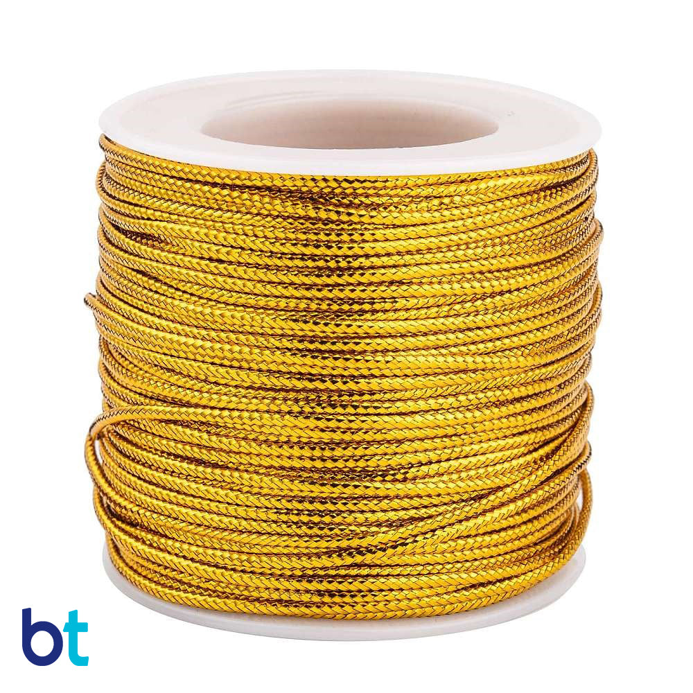Gold tone metallic braided cord 1.5mm thick and approx. 50m or 55yds long. This polyester cord has multiple metallic strands braided together to form the cord. Imported from China and supplied on a spool.