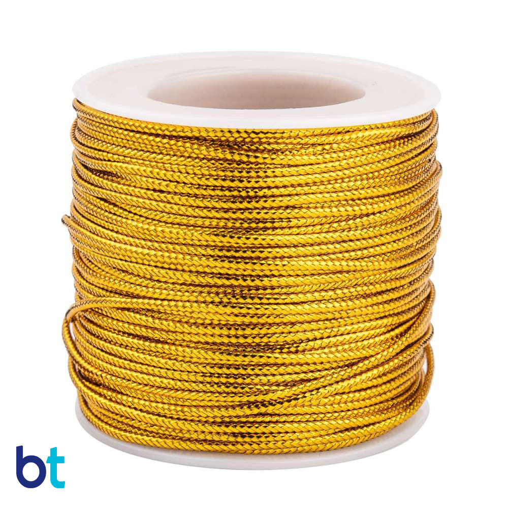 Gold tone metallic braided cord 2mm thick and approx. 40m or 44yds long. This polyester cord has multiple metallic strands braided together to form the cord. Imported from China and supplied on a spool.