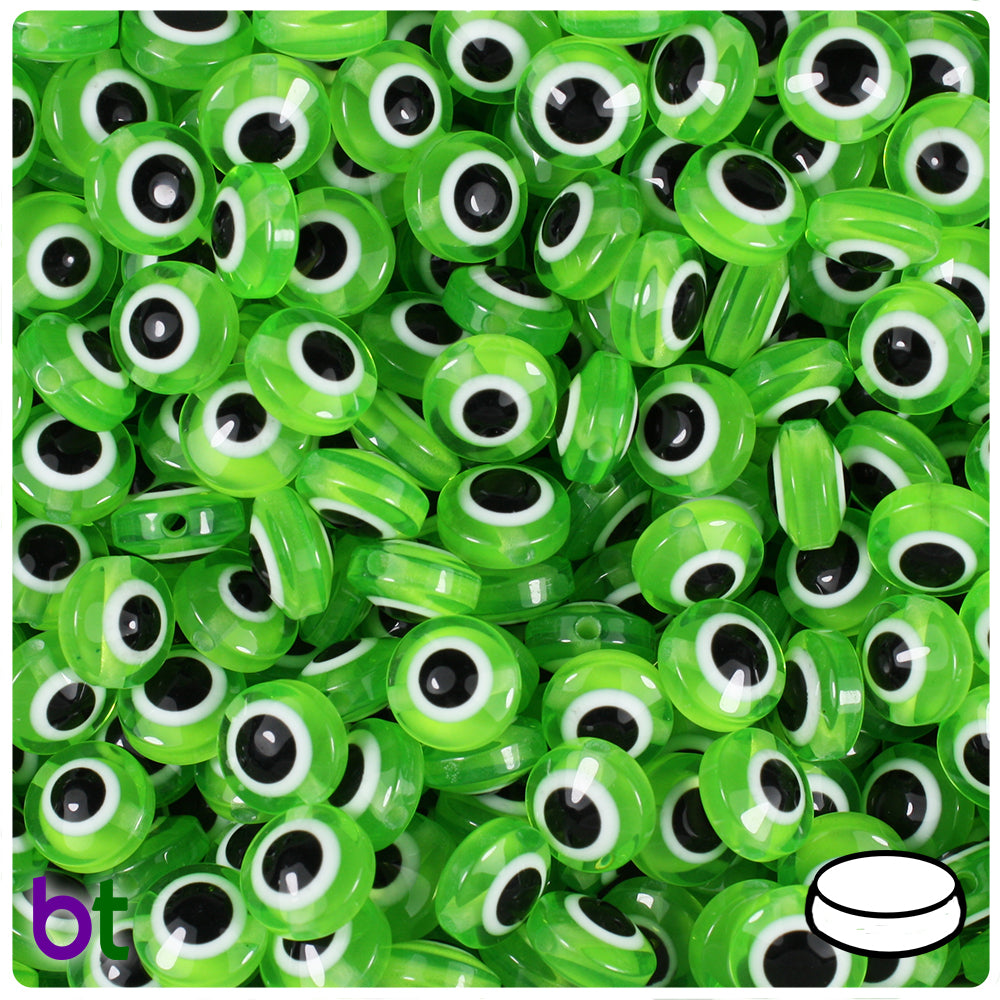 Green Transparent 10mm Flat Round Resin Beads - Evil Eye Design (100pcs)