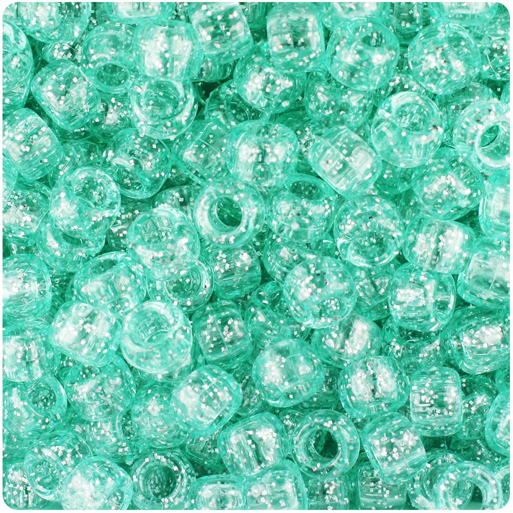 These green aqua sparkle standard barrel pony beads measure 9mm wide by 6mm high and have a 4mm hole which runs vertically down the middle of the beads. Our plastic pony beads are made in the USA with high-quality plastic and come in packs of approx. 100 beads.