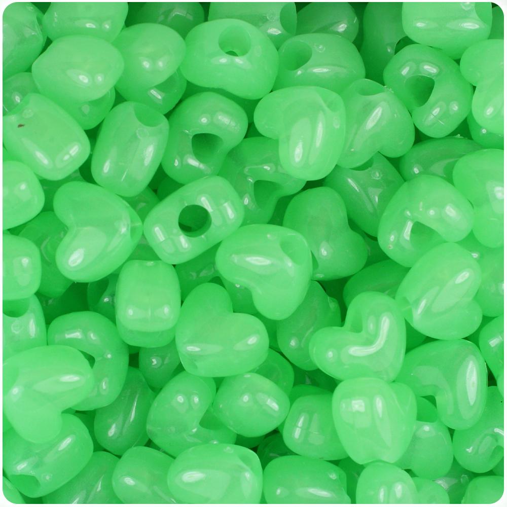These green glow heart shaped pony beads measure 12mm wide by 10mm high and have a 4mm hole which runs vertically down the middle of the beads. Our plastic pony beads are made in the USA with high-quality plastic and come in packs of approx. 50 beads.