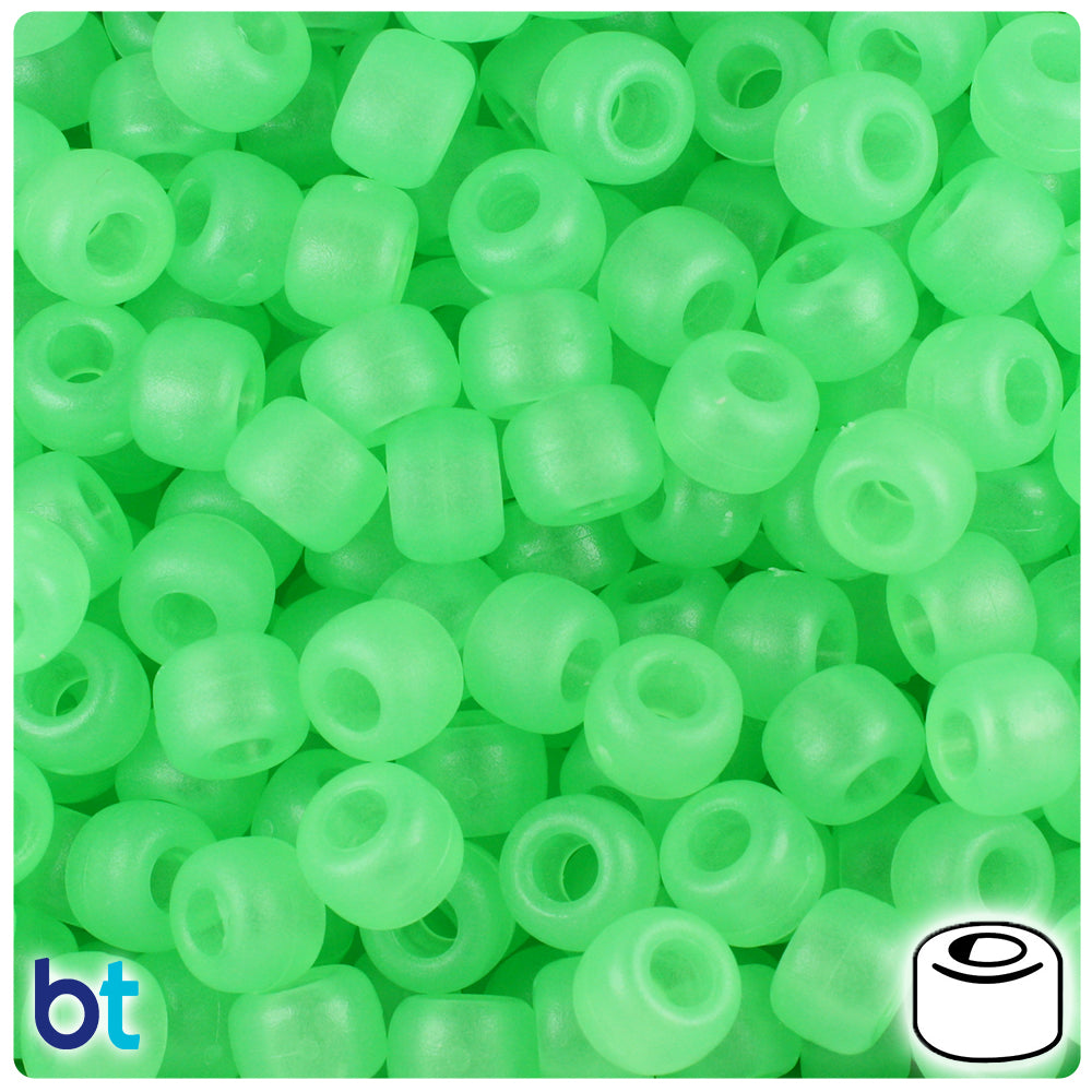Our green, in a semi glow textured frosted finish barrel shaped plastic pony beads, measure 6mm high by 9mm wide and have a 4mm hole which runs vertically down the middle of the bead. These plastic pony beads are made in the USA with high-quality, non-toxic polystyrene plastic and sold in packs of approx. 500 beads. Pony beads are ideal for a wide variety of projects like; necklaces, bracelets, kandi and dream catchers. The larger hole is easier to thread so makes them perfect for children's parties, activity camps and VBS.