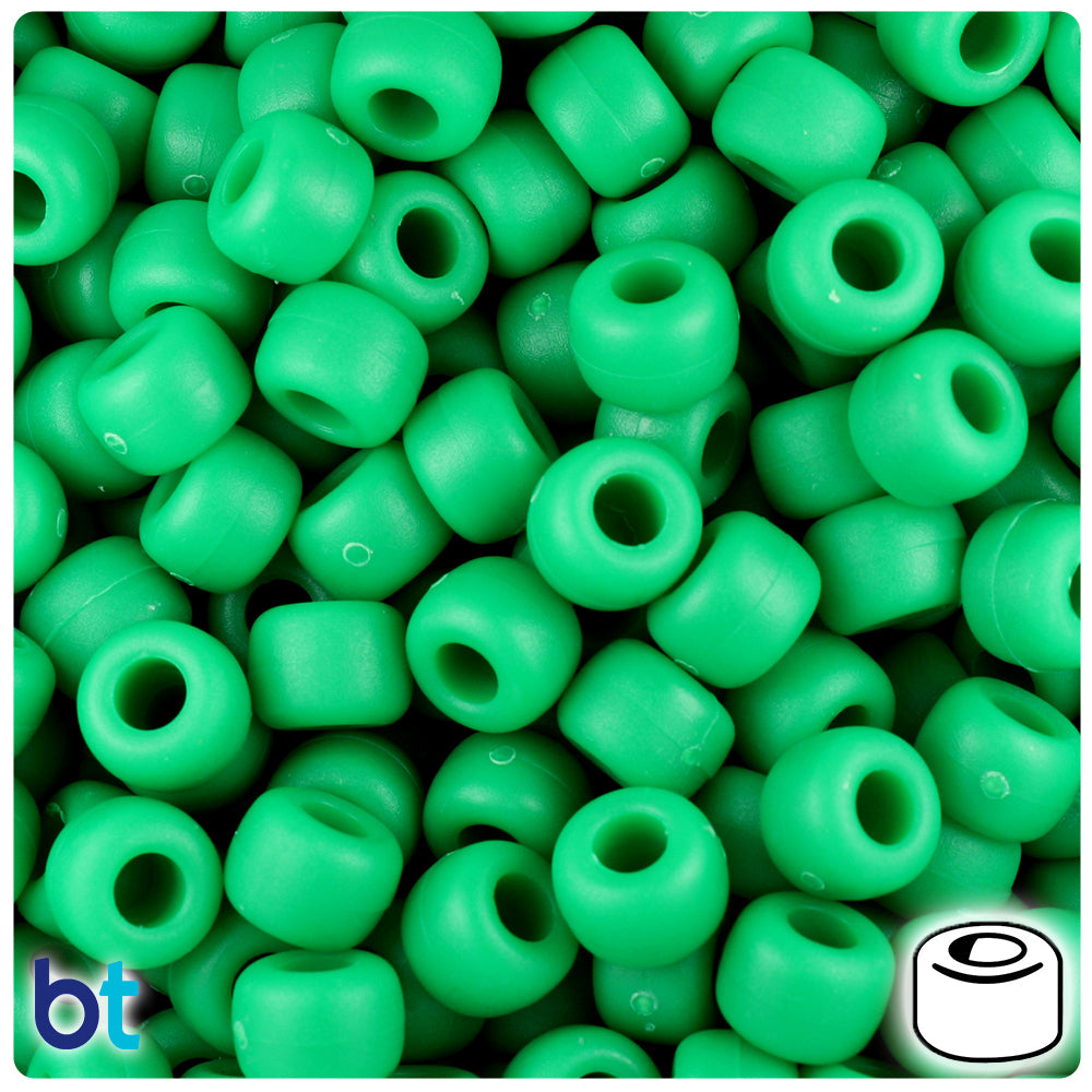 Our green, in a textured matte finish barrel shaped plastic pony beads, measure 6mm high by 9mm wide and have a 4mm hole which runs vertically down the middle of the bead. These plastic pony beads are made in the USA with high-quality, non-toxic polystyrene plastic and sold in packs of approx. 500 beads. Pony beads are ideal for a wide variety of projects like; necklaces, bracelets, kandi and dream catchers. The larger hole is easier to thread so makes them perfect for children's parties, activity camps and VBS.