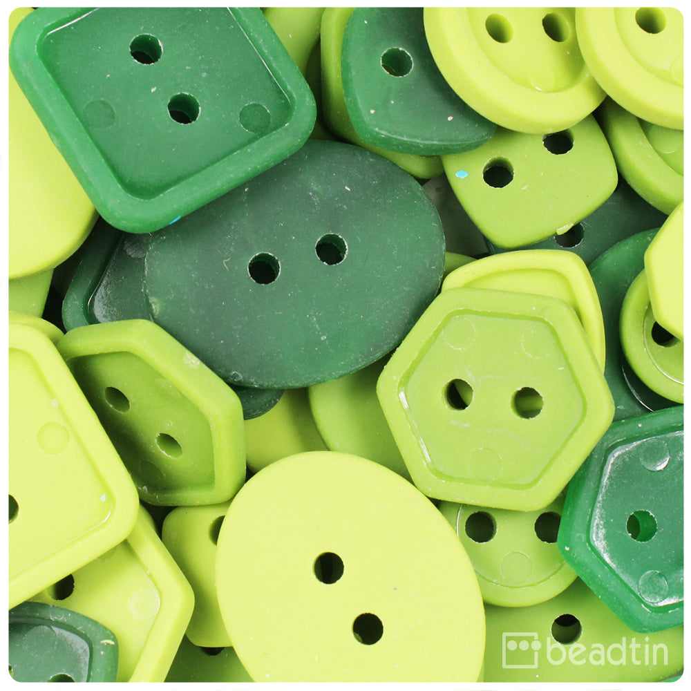 Craft button mix of oval, square, rectangle, round and hexagon in a matte finish with random colors. Made in the USA and sold in packs of approx. 65 buttons