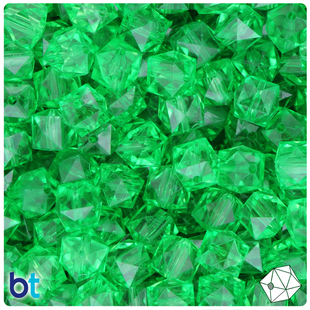 These green transparent faceted cube / polygon plastic beads measure 10x10mm with a 1.5mm hole which runs vertically through the center of the bead. Our plastic craft beads are imported from China and these come in packs of approx. 100 beads. Craft Beads are ideal for making necklaces, bracelets, key chain and other jewelry projects, as well as holiday decorations, home bedazzling and many other craft ideas. They are also perfect for children's craft projects and church or activity camps. Craft Beads come with a small smaller, so they will fit on a range of threading material like elastic cord, stretchy cord and jewelry wire.