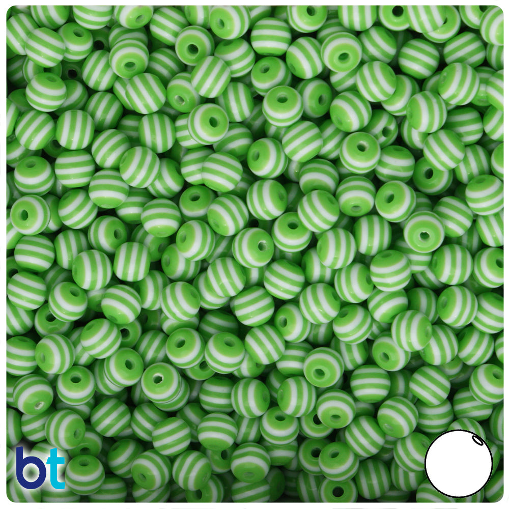 These light green & white striped round resin beads measure 6mm diameter with a 1mm hole which runs through the center of the bead. Our resin craft beads are imported from China and these come in packs of approx. 150 beads.