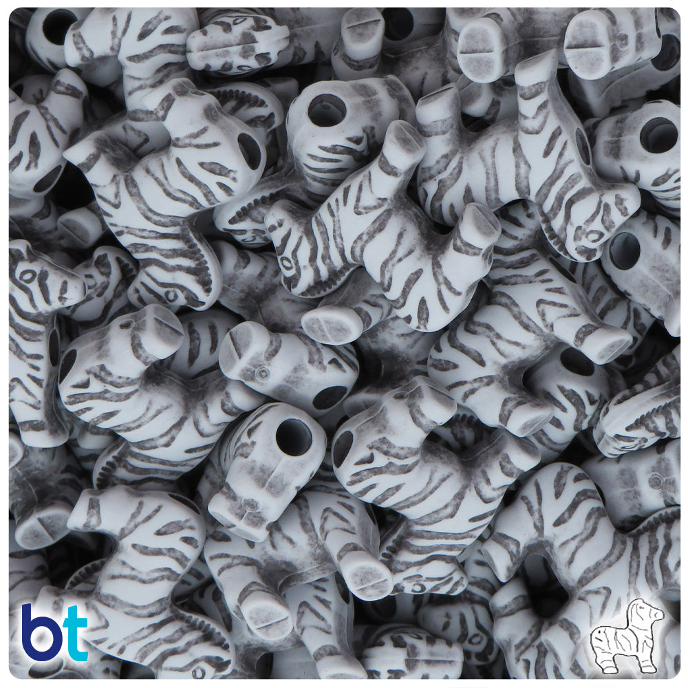Our grey or gray, with a black detailed antique finish, zebra shaped plastic pony beads from the safari animals series. These pony beads measure 22mm long and 20mm high, with a 4mm hole running horizontally across the middle of the bead. These plastic pony beads are made in the USA with high-quality, non-toxic polystyrene plastic and sold in packs of approx. 24 beads. Pony beads are ideal for a wide variety of projects like; necklaces, bracelets, kandi, filler beads and dream catchers. The larger hole is easier to thread so makes them perfect for children's parties, activity camps and VBS.