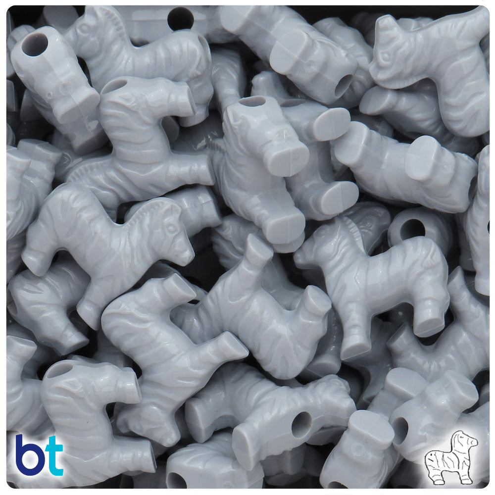 Our grey or gray, in a shiny opaque finish, zebra shaped plastic pony beads from the safari animals series. These pony beads measure 22mm long and 20mm high, with a 4mm hole running horizontally across the middle of the bead. These plastic pony beads are made in the USA with high-quality, non-toxic polystyrene plastic and sold in packs of approx. 24 beads. Pony beads are ideal for a wide variety of projects like; necklaces, bracelets, kandi, filler beads and dream catchers. The larger hole is easier to thread so makes them perfect for children's parties, activity camps and VBS.