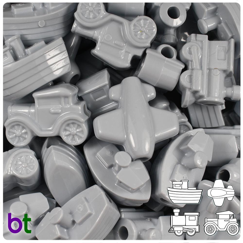These grey or gray opaque mini mobile shaped pony beads in a mix of planes, trains, cars and boats. Measuring between 22mm and 25mm with a 4mm hole which runs down the middle of the beads. These plastic novelty pony beads are made in the USA with high-quality plastic and come in packs of 8 beads.