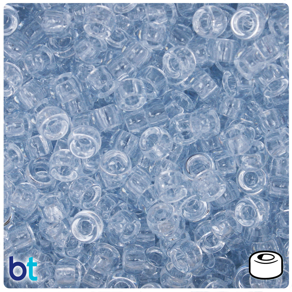 These ice blue transparent mini barrel pony beads measure 6.5mm wide by 4mm high and have a 3mm hole which runs vertically down the middle of the beads. Our plastic pony beads are made in the USA with high-quality plastic and come in packs of approx. 200 beads.