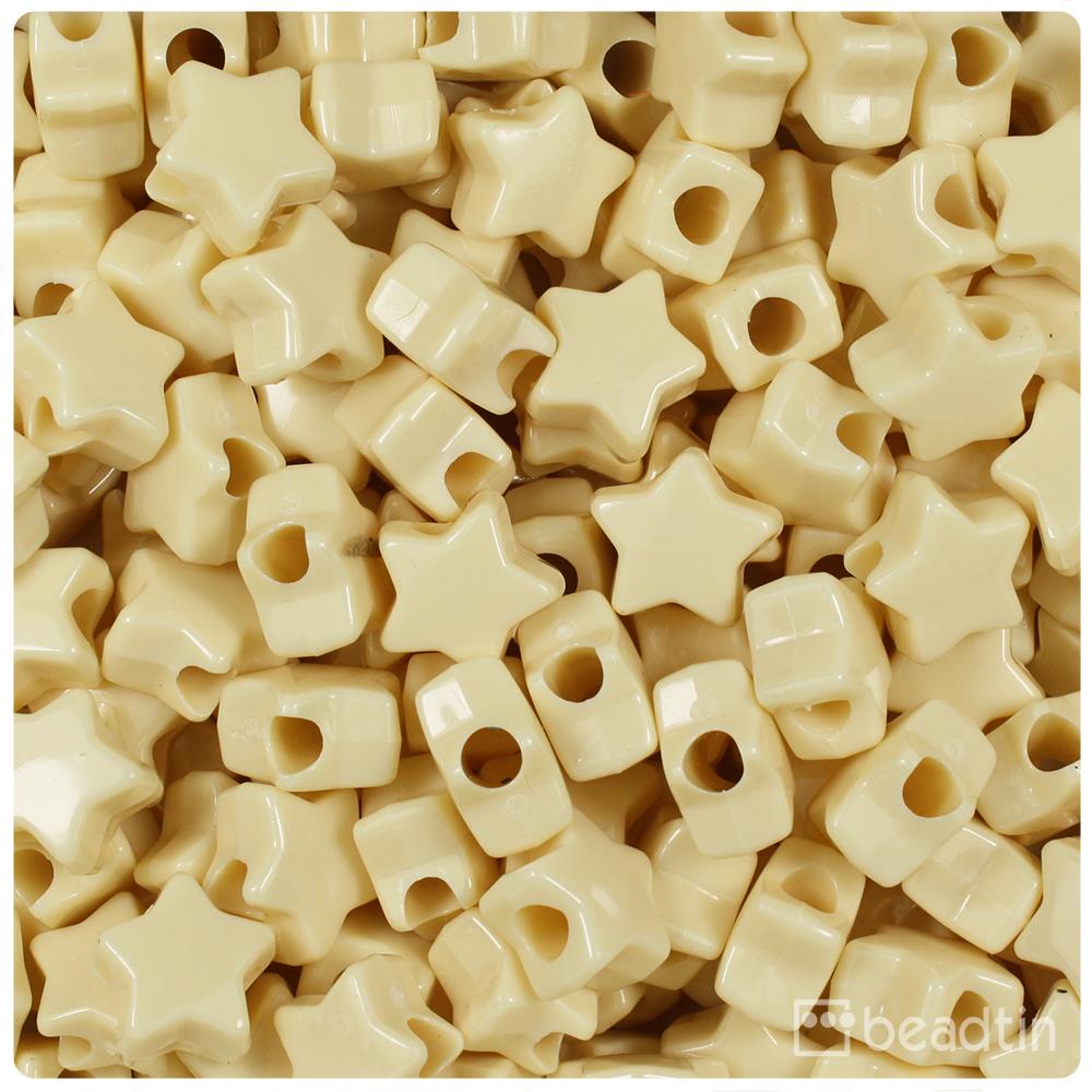 These ivory opaque star shaped pony beads measure 13mm wide by 13mm high and have a 4mm hole which runs vertically down the middle of the beads. Our plastic pony beads are made in the USA with high-quality plastic and come in packs of approx. 50 beads.