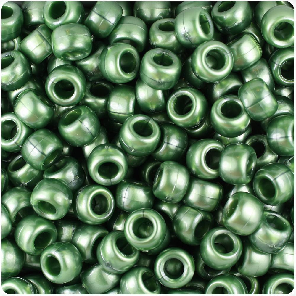 These green luster shimmering pearl standard barrel pony beads measure 9mm wide by 6mm high and have a 4mm hole which runs vertically down the middle of the beads. Our plastic pony beads are made in the USA with high-quality plastic and come in packs of approx. 100 beads.