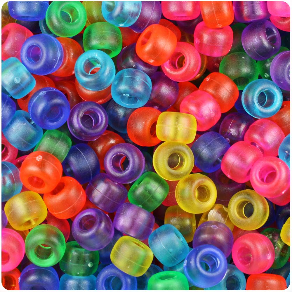 These jelly mixed colors frosted standard barrel pony beads measure 9mm wide by 6mm high and have a 4mm hole which runs vertically down the middle of the beads. Our plastic pony beads are made in the USA with high-quality plastic and come in packs of approx. 100 beads.