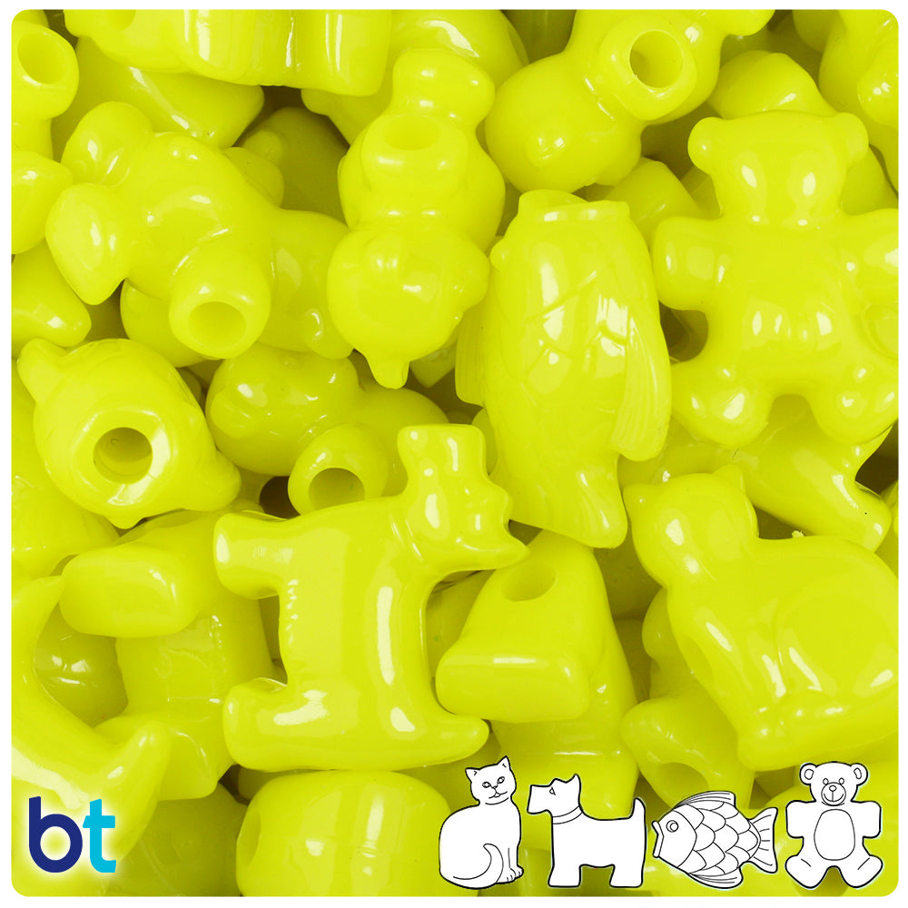 A pack of lemon yellow neon bright pet parade shaped novelty pony beads, in a mix of scotty dogs, cats, fishes and teddy bears. These plastic pony beads measure between 23mm and 25mm, all with a 4mm hole running through the bead. Our pony beads are made in the USA with non-toxic polystyrene plastic and are sold in packs of 8 beads.