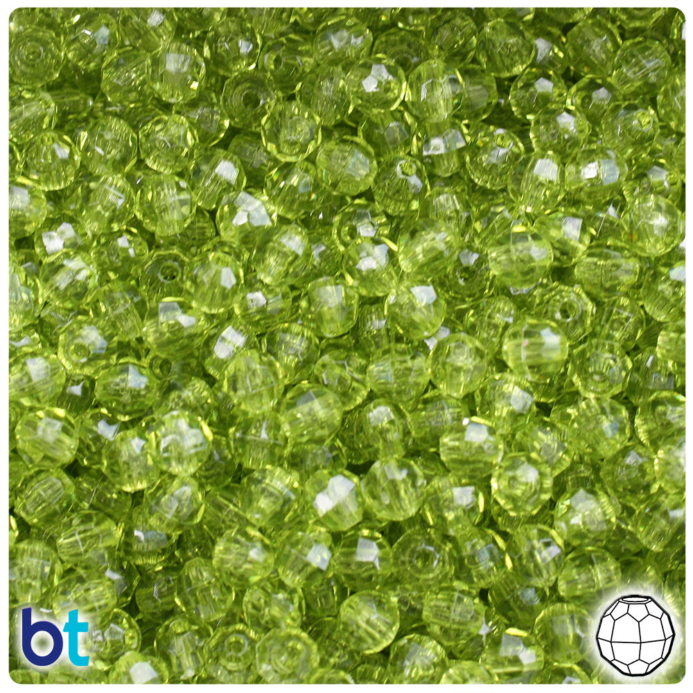 Our light avocado green, in a see through transparent finish, faceted round plastic craft beads measure 6mm diameter and have a 1.3mm hole which runs through the center of the bead. These plastic craft beads are made in the USA with high-quality non-toxic plastic and come in packs of approx. 600 beads. Craft Beads are ideal for making necklaces, bracelets, key chain and other jewelry projects, as well as holiday decorations, home bedazzling and many other craft ideas. They are also perfect for children's craft projects and church or activity camps. Craft Beads come with a smaller hole, so they will fit on a range of threading material like elastic cord, stretchy cord and jewelry wire.