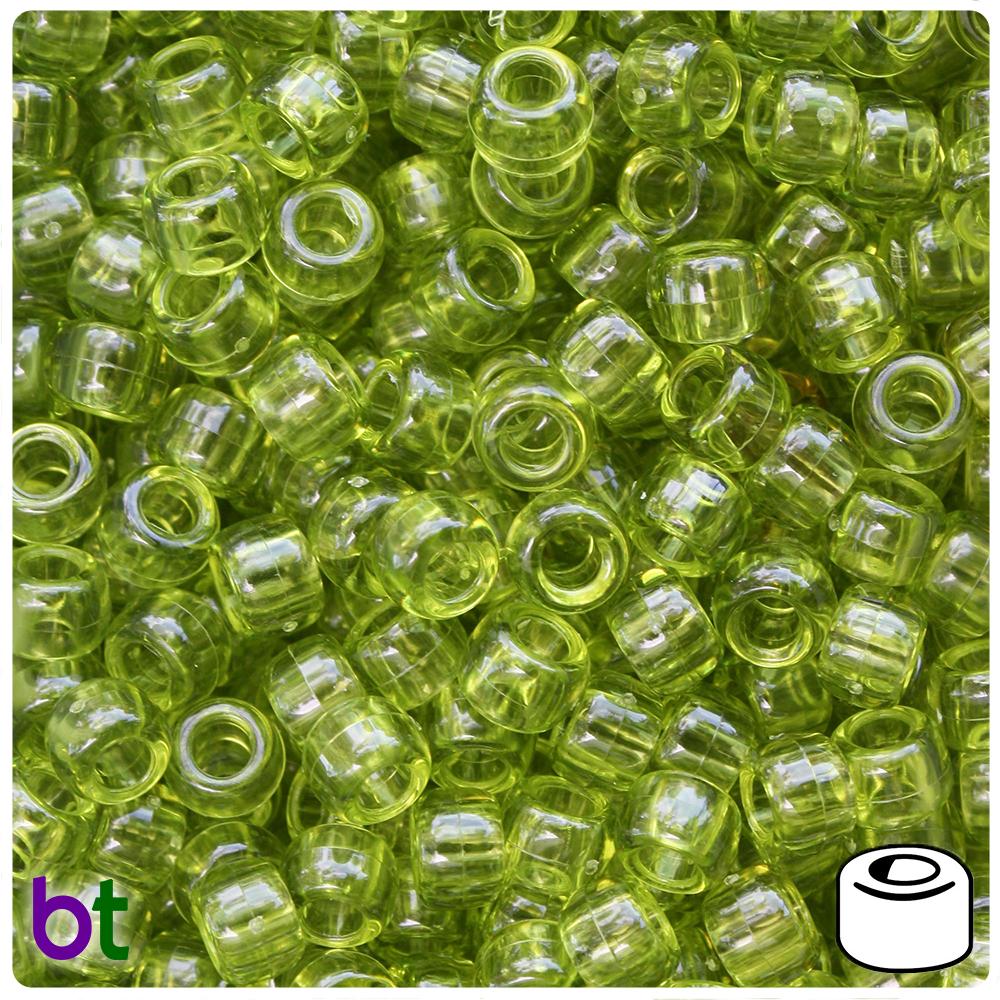 These light avocado green transparent standard barrel pony beads measure 9mm wide by 6mm high and have a 4mm hole which runs vertically down the middle of the beads. Our plastic pony beads are made in the USA with high-quality plastic and come in packs of approx. 100 beads.