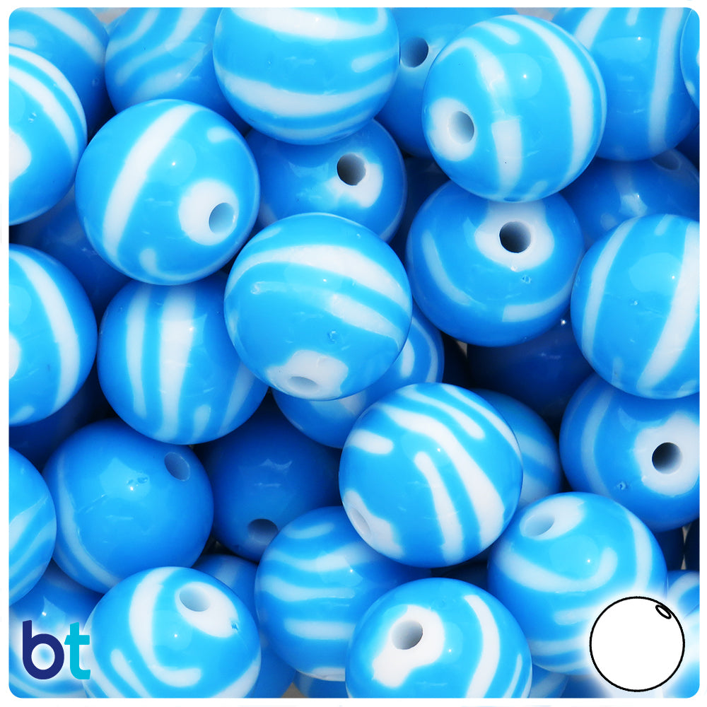 Our light blue with white zebra stripes, shiny opaque finish round plastic craft beads measure 19mm by 18.3mm (hole to hole) and have a 2.5mm hole which runs through the center of the bead. These plastic craft beads are imported from China and come in packs of approx. 12 beads. Craft Beads are ideal for making necklaces, bracelets, key chain and other jewelry projects, as well as holiday decorations, home bedazzling and many other craft ideas. These chunky style beads are also known as bubblegum beads due to their size