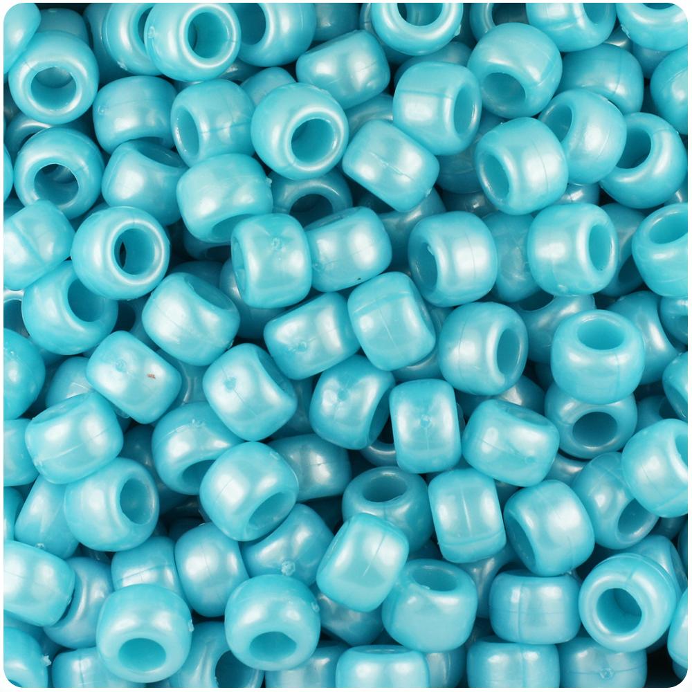 These light blue shimmering pearl standard barrel pony beads measure 9mm wide by 6mm high and have a 4mm hole which runs vertically down the middle of the beads. Our plastic pony beads are made in the USA with high-quality plastic and come in packs of approx. 100 beads.
