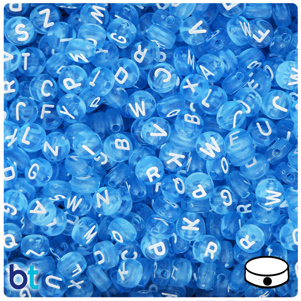 These light blue transparent coin shaped alphabet plastic beads measure 7mm diameter by 4mm thick and have a 1mm hole which runs horizontally to the letter which is imprinted on both sides of the beads in white. This pack contains a random mix of letters. These craft beads are imported from China and sold in packs of approx. 250 beads. Our alpha beads are perfect for personalizing necklaces, bracelets, key chains and all manner of kandi designs.