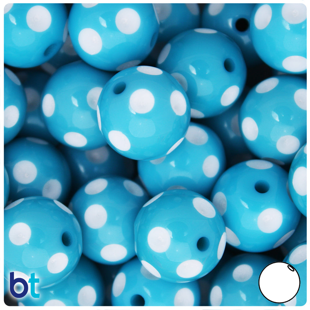 Our light blue with white polka dot shiny opaque finish round plastic craft beads measure 20mm diameter and have a 2mm hole which runs through the center of the bead, they are also known as bubblegum beads due to the chunky size. These plastic craft beads are imported from China and come in packs of approx. 10 beads. Craft Beads are ideal for making necklaces, bracelets, key chain and other jewelry projects, as well as holiday decorations, home bedazzling and many other craft ideas. They are also perfect for children's craft projects and church or activity camps. Craft Beads come with a small 1-2mm hole, so they will fit on a range of threading material like elastic cord, stretchy cord and jewelry wire.