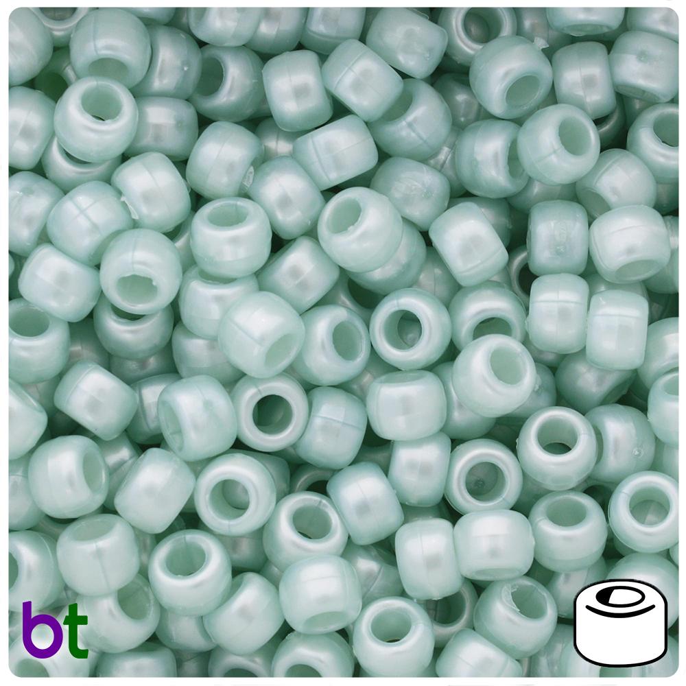 These light Caribbean blue shimmering pearl standard barrel pony beads measure 9mm wide by 6mm high and have a 4mm hole which runs vertically down the middle of the beads. Our plastic pony beads are made in the USA with high-quality plastic and come in packs of approx. 100 beads.