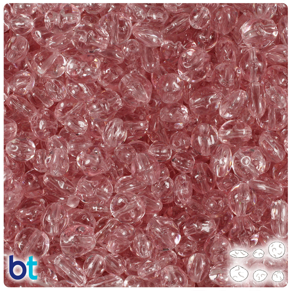 Our light coral pink, in a see through transparent finish, freshwater pearl shaped plastic craft beads. These craft beads measure between 5-10mm in diameter and have a 1mm hole that runs through the center of the bead. These plastic craft beads are made in the USA with high-quality plastic and come in packs of 50g approx. 250 beads. Craft Beads are ideal for making necklaces, bracelets, key chain and other jewelry projects, as well as holiday decorations, home bedazzling and many other craft ideas. They are also perfect for children's craft projects and church or activity camps. Craft Beads come with a small 1-2mm hole, so they will fit on a range of threading material like elastic cord, stretchy cord and jewelry wire.