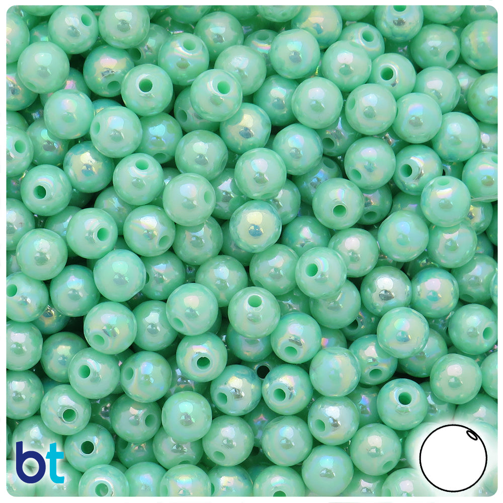 Our light green opaque AB (Aurora Borealis) finish round plastic craft beads measure 7.6mm by 7.1mm (hole to hole) and have a 1.2mm hole which runs through the center of the bead. The finish on these beads almost creates a pearlized/metallic look. These plastic/acrylic craft beads are imported from China and come in packs of approx. 250 beads. Craft Beads are ideal for making necklaces, bracelets, key chain and other jewelry projects, as well as holiday decorations, home bedazzling and many other craft ideas.