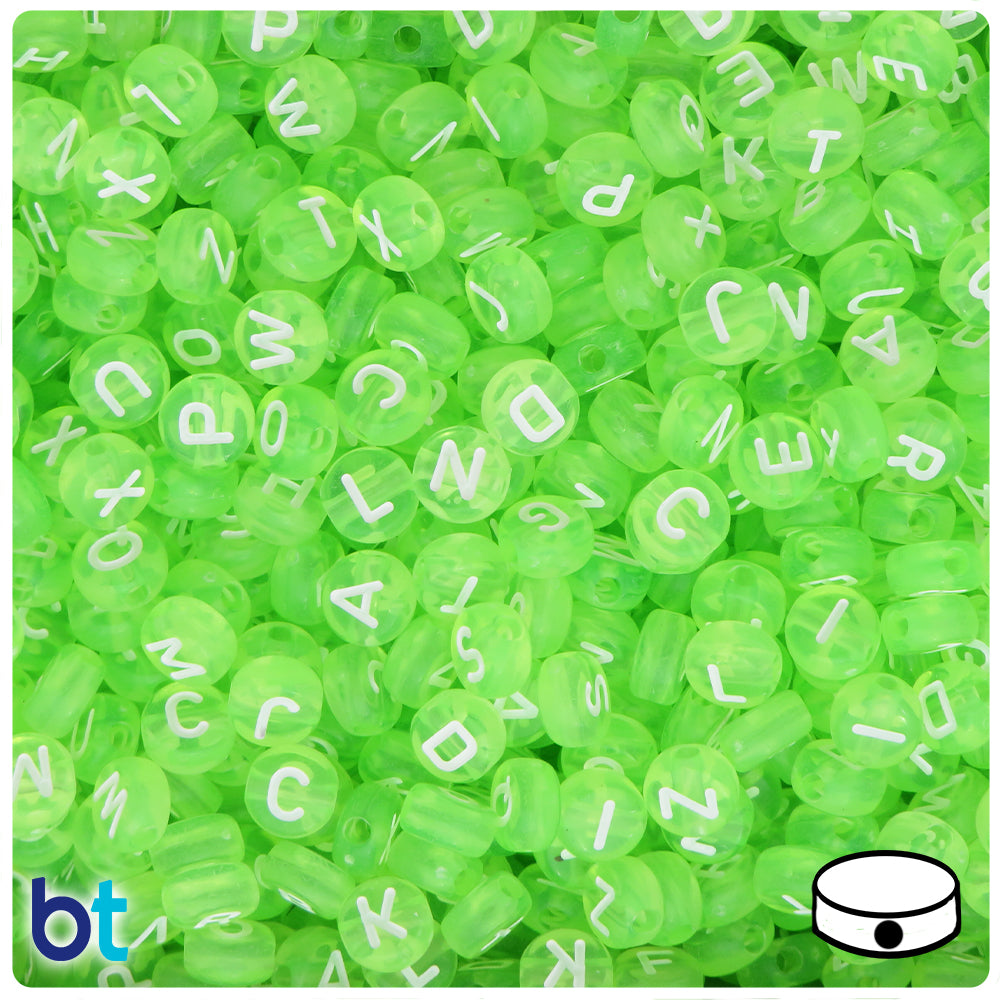 These light green transparent coin shaped alphabet plastic beads measure 7mm diameter by 4mm thick and have a 1mm hole which runs horizontally to the letter which is imprinted on both sides of the beads in white. This pack contains a random mix of letters. These craft beads are imported from China and sold in packs of approx. 250 beads. Our alpha beads are perfect for personalizing necklaces, bracelets, key chains and all manner of kandi designs.