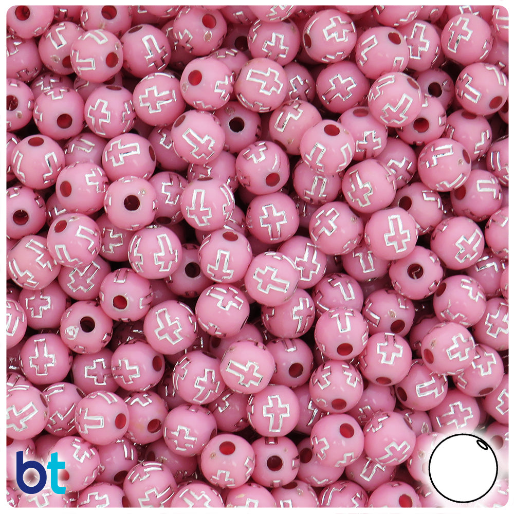 Our light pink opaque finish round plastic accent craft beads measure 8mm diameter and have a 1.2mm hole which runs through the center of the bead. These beads are imported from China, featuring silver accent crosses which are imprinted around the bead and come in packs of approx. 150 beads. Craft Beads are ideal for making necklaces, bracelets, key chain and other jewelry projects, as well as holiday decorations, home bedazzling and many other craft ideas. They are also perfect for children's craft projects and church or activity camps. Craft Beads come with a small 1-2mm hole, so they will fit on a range of threading material like elastic cord, stretchy cord and jewelry wire.