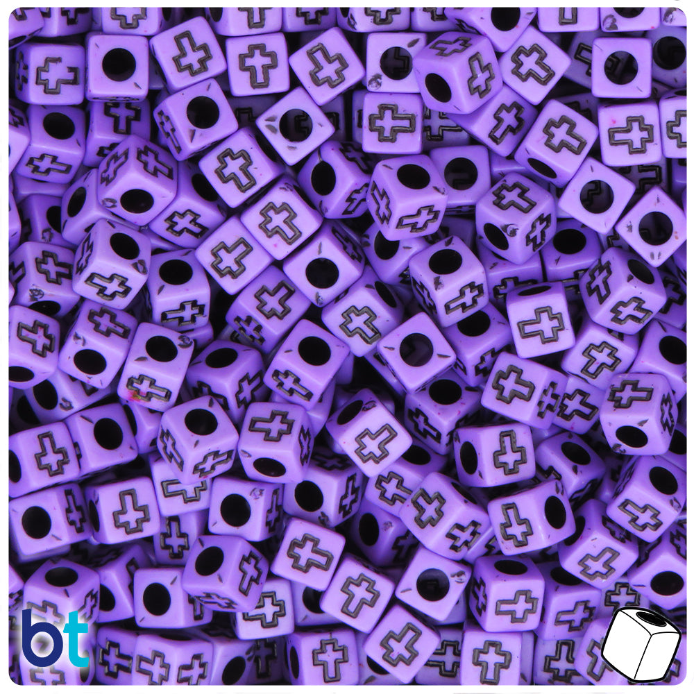 These light purple opaque 6mm cube alphabet plastic beads have a 3mm hole which runs horizontally to the crosses which is imprinted on four sides of the beads in black. Imported from China and sold in packs of approx. 200 beads.