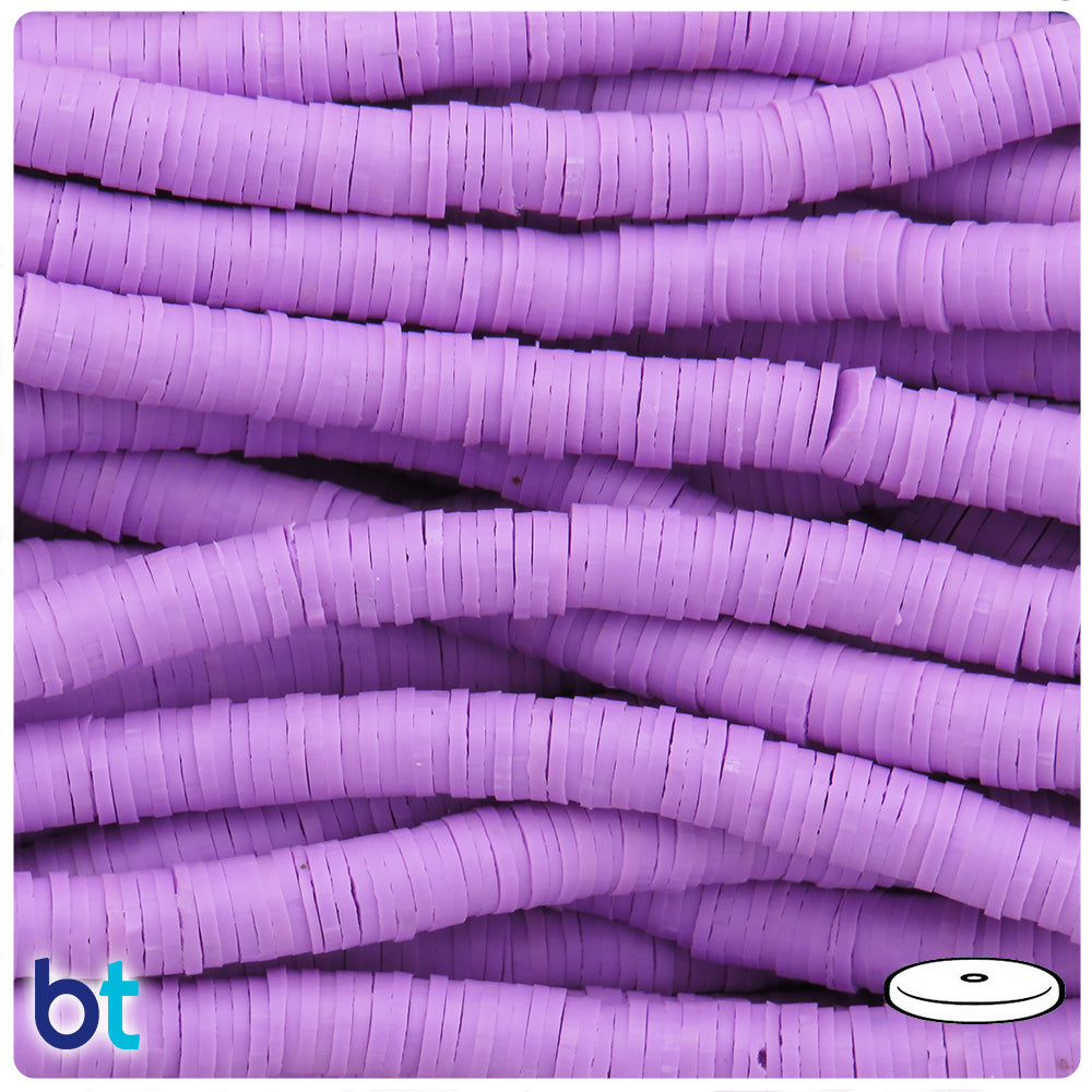 These light purple opaque polymer clay heishi disc craft beads measure 6mm diameter, about 1mm thick and have a 2mm center hole. Our polymer clay craft beads are imported from China and these come in packs of approx. 700 beads.