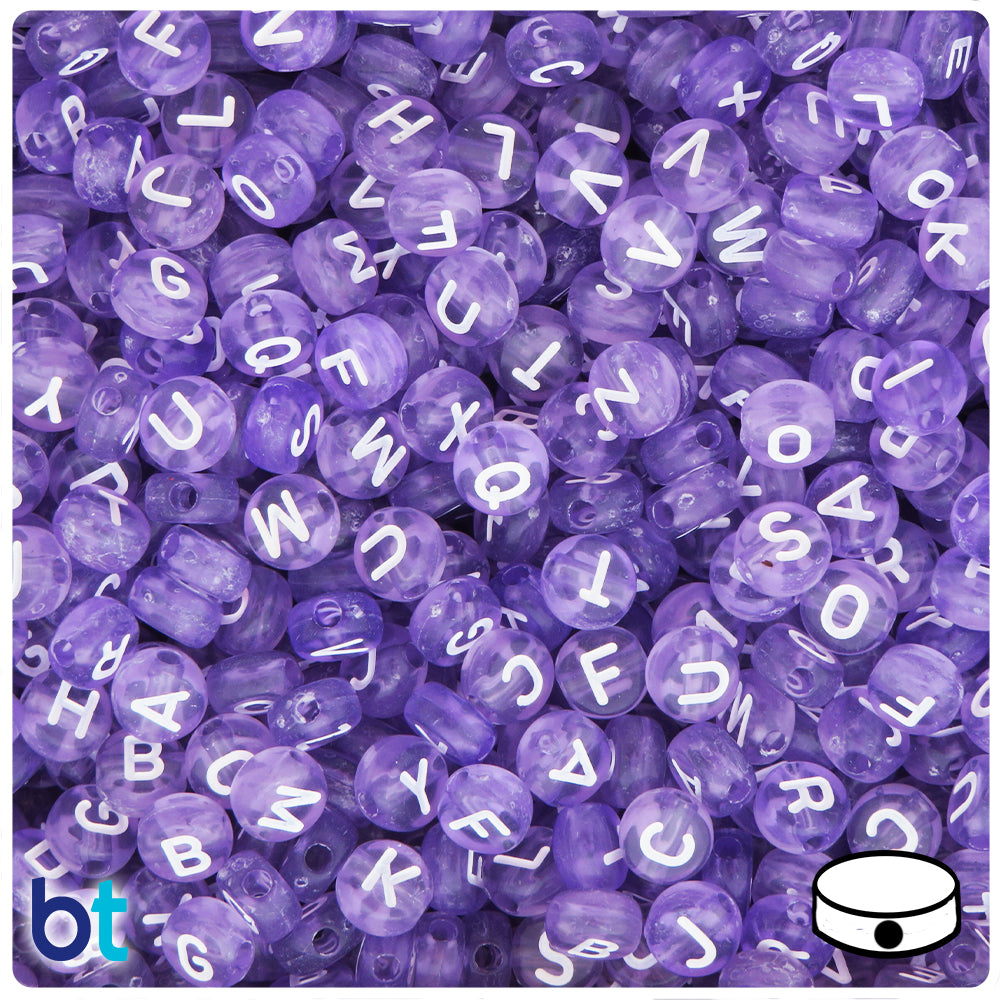 These light purple transparent coin shaped alphabet plastic beads measure 7mm diameter by 4mm thick and have a 1mm hole which runs horizontally to the letter which is imprinted on both sides of the beads in white. This pack contains a random mix of letters. These craft beads are imported from China and sold in packs of approx. 250 beads. Our alpha beads are perfect for personalizing necklaces, bracelets, key chains and all manner of kandi designs.
