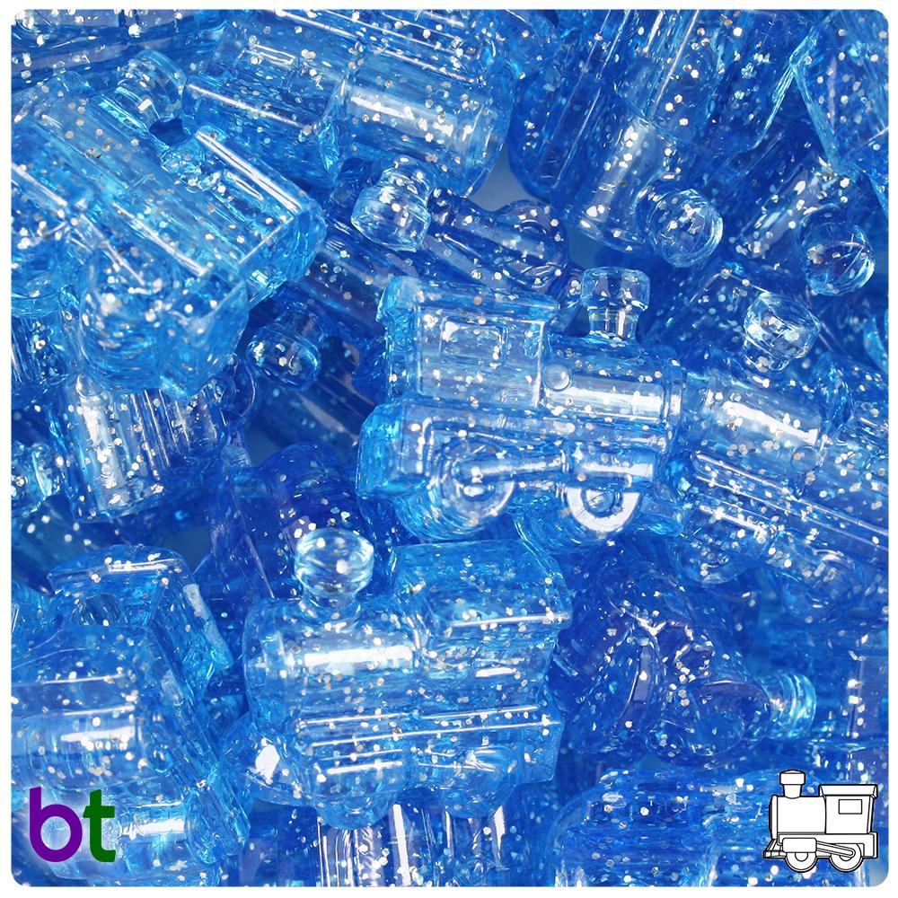 These light sapphire blue sparkle finish train shaped pony beads, from the Mini Mobile series, measure 22mm long by 19mm high and have a 4mm hole which runs horizontally through the middle of the bead. These plastic novelty pony beads are made in the USA with high-quality plastic and come in packs of 8 beads.