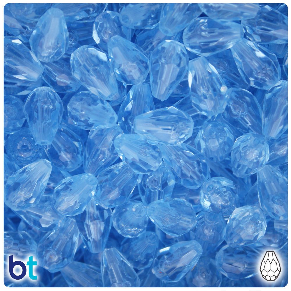 Our light sapphire blue, in a see through transparent finish, faceted pear shaped plastic craft beads measure 13mm high by 8mm wide at the widest point and have a 1mm hole running through the center of the bead. These plastic craft beads are made in the USA with high-quality plastic and come in packs of approx. 30 beads. Craft Beads are ideal for making necklaces, bracelets, key chain and other jewelry projects, as well as holiday decorations, home bedazzling and many other craft ideas. They are also perfect for children's craft projects and church or activity camps. Craft Beads come with a small 1-2mm hole, so they will fit on a range of threading material like elastic cord, stretchy cord and jewelry wire.
