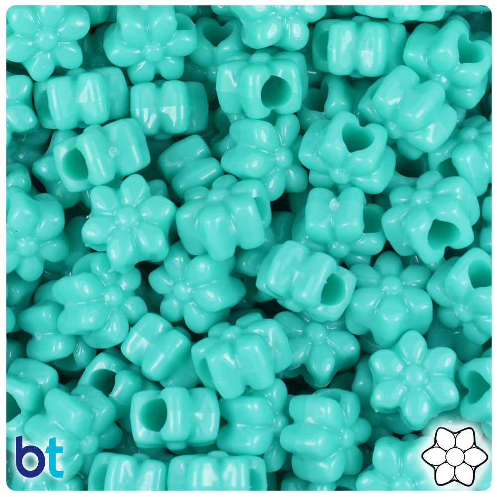 Our light turquoise blue, in a shiny opaque finish, flower shaped plastic pony beads, measure 13mm wide by 13mm high and have a 4mm hole which runs vertically down the middle of the bead. These plastic pony beads are made in the USA with high-quality, non-toxic polystyrene plastic and sold in packs of approx. 250 beads. Pony beads are ideal for a wide variety of projects like; necklaces, bracelets, kandi and dream catchers. The larger hole is easier to thread so makes them perfect for children's parties, activity camps and VBS.