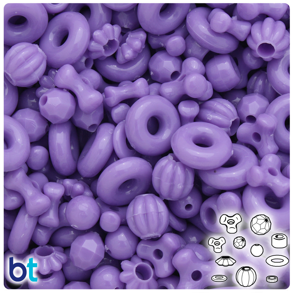 Our lilac purple, in a shiny opaque finish, mixed bead shaped plastic craft beads in a mixture of rounds, faceted rounds, tribeads, donuts, discs, floral rings, melons, and mini barrels. These craft beads measure between 6mm and 14mm and have both 1mm and 4mm holes. These plastic craft beads are made in the USA with high-quality plastic and come in packs of 4oz approx. 300 beads. Craft Beads are ideal for making necklaces, bracelets, key chain and other jewelry projects, as well as holiday decorations, home bedazzling and many other craft ideas. They are also perfect for children's craft projects and church or activity camps. Craft Beads come with a small 1-2mm hole, so they will fit on a range of threading material like elastic cord, stretchy cord and jewelry wire.