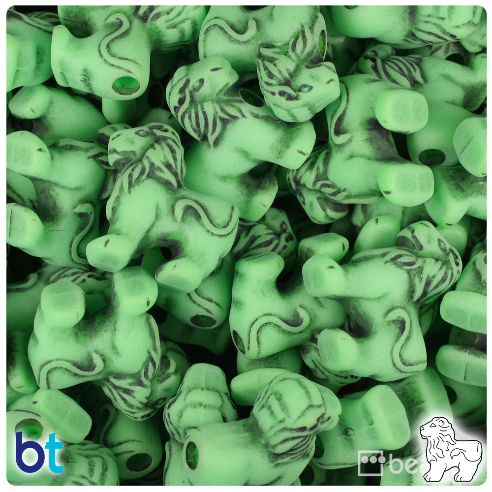 Our lime green, with a black detailed antique finish, lion shaped plastic pony beads from the safari animals series. These pony beads measure 22mm high by 22mm wide, with a 4mm hole running horizontally across the middle of the bead. These plastic pony beads are made in the USA with high-quality, non-toxic polystyrene plastic and sold in packs of approx. 24 beads. Pony beads are ideal for a wide variety of projects like; necklaces, bracelets, kandi, filler beads and dream catchers. The larger hole is easier to thread so makes them perfect for children's parties, activity camps and VBS.