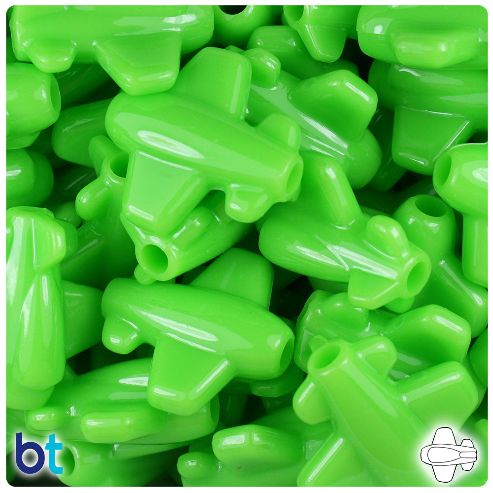Our lime green, in a shiny opaque finish, airplane shaped plastic pony beads from the mini mobiles transport series. These pony beads measure 25mm wide by 25mm long, with a 4mm hole running horizontally across the middle of the bead. These plastic pony beads are made in the USA with high-quality, non-toxic polystyrene plastic and sold in packs of approx. 24 beads. Pony beads are ideal for a wide variety of projects like; necklaces, bracelets, kandi, filler beads and dream catchers. The larger hole is easier to thread so makes them perfect for children's parties, activity camps and VBS.