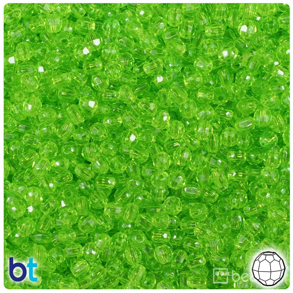 Our lime green, in a see through transparent finish, faceted round plastic craft beads measure 4mm diameter and have a 1mm hole which runs through the center of the bead. These plastic craft beads are made in the USA with high-quality plastic and come in packs of approx. 1350 beads. Craft Beads are ideal for making necklaces, bracelets, key chain and other jewelry projects, as well as holiday decorations, home bedazzling and many other craft ideas. They are also perfect for children's craft projects and church or activity camps. Craft Beads come with a small 1-2mm hole, so they will fit on a range of threading material like elastic cord, stretchy cord and jewelry wire.