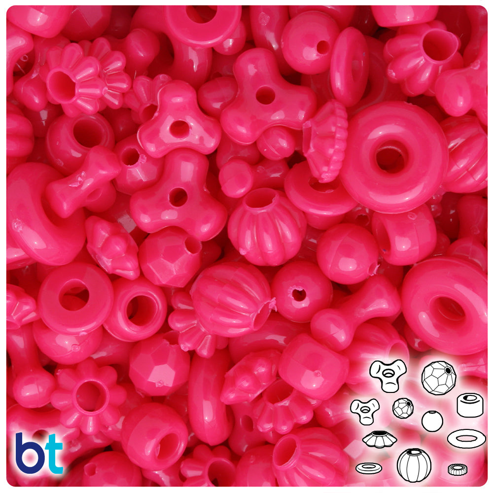 Our magenta pink, in a bold and bright neon like finish, mixed bead shaped plastic craft beads in a mixture of rounds, faceted rounds, tribeads, donuts, discs, floral rings, melons, and mini barrels. These craft beads measure between 6mm and 14mm and have both 1mm and 4mm holes. These plastic craft beads are made in the USA with high-quality plastic and come in packs of 4oz approx. 300 beads. Craft Beads are ideal for making necklaces, bracelets, key chain and other jewelry projects, as well as holiday decorations, home bedazzling and many other craft ideas. They are also perfect for children's craft projects and church or activity camps. Craft Beads come with a small 1-2mm hole, so they will fit on a range of threading material like elastic cord, stretchy cord and jewelry wire.