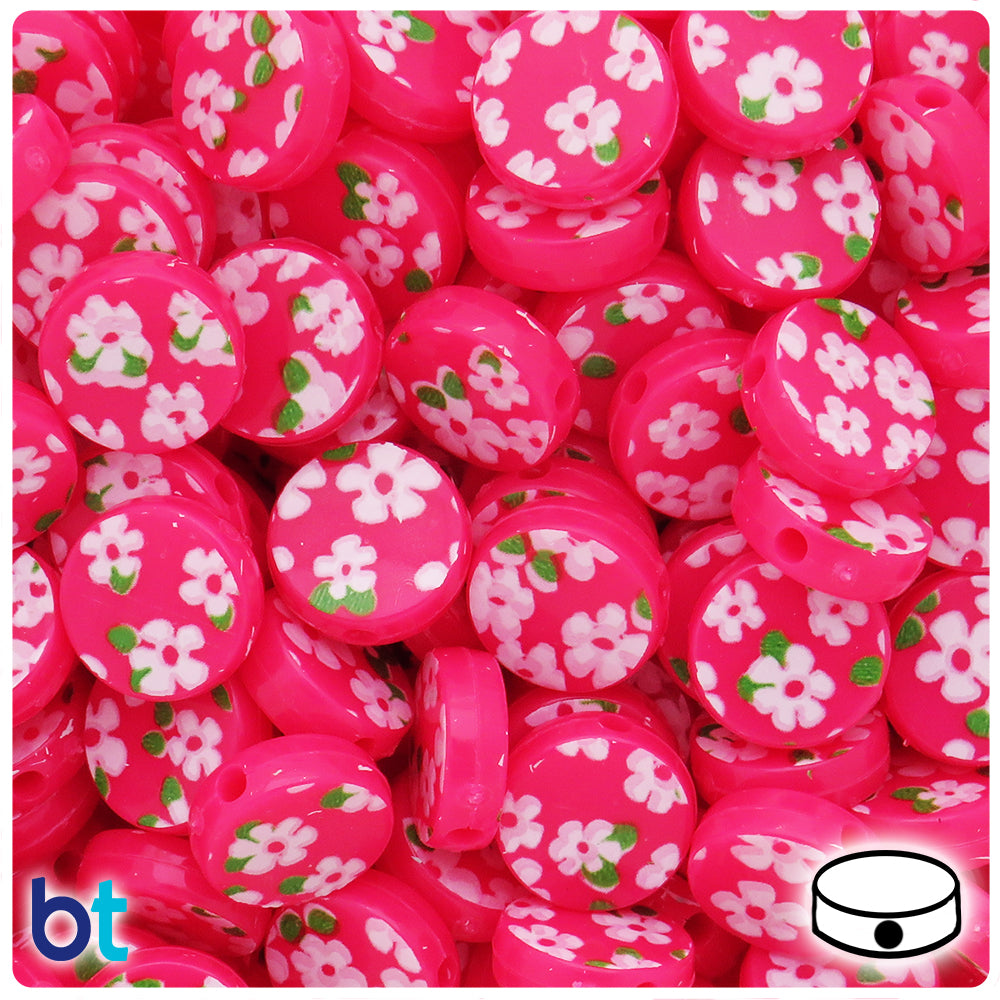 Our magenta oink neon bright finish, coin shaped plastic craft beads measure 13mm diameter, 5mm thick and have a 1mm hole which runs through the center of the bead. The special flower print edtion, has white flowers printed on both sides of all beads. These plastic craft beads are made in the USA with high-quality plastic and come in packs of approx 150 beads. Craft Beads are ideal for making necklaces, bracelets, key chain and other jewelry projects, as well as holiday decorations, home bedazzling and many other craft ideas.