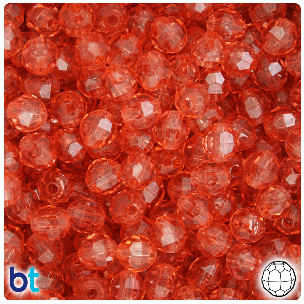 Our medium coral orange, in a see through transparent finish faceted round plastic craft beads measure 8mm diameter and have a 1.5mm hole which runs through the center of the bead. These plastic craft beads are made in the USA with high-quality non-toxic plastic and come in packs of approx. 450 beads. Craft Beads are ideal for making necklaces, bracelets, key chain and other jewelry projects, as well as holiday decorations, home bedazzling and many other craft ideas. They are also perfect for children's craft projects and church or activity camps. Craft Beads come with a smaller hole, so they will fit on a range of threading material like elastic cord, stretchy cord and jewelry wire.