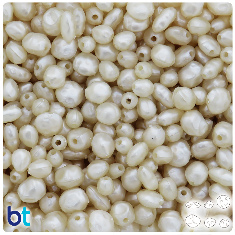 Our medium peach in a shimmering pearl finish, freshwater pearl shaped plastic craft beads. These craft beads measure between 5-10mm in diameter and have a 1mm hole that runs through the center of the bead. These plastic craft beads are made in the USA with high-quality plastic and come in packs of 50g approx. 250 beads. Craft Beads are ideal for making necklaces, bracelets, key chain and other jewelry projects, as well as holiday decorations, home bedazzling and many other craft ideas. They are also perfect for children's craft projects and church or activity camps. Craft Beads come with a small 1-2mm hole, so they will fit on a range of threading material like elastic cord, stretchy cord and jewelry wire.