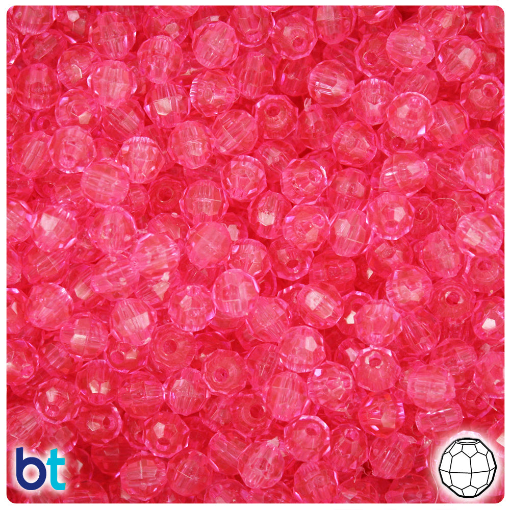 Our medium pink, in a see through transparent finish, faceted round plastic craft beads measure 6mm diameter and have a 1.3mm hole which runs through the center of the bead. These plastic craft beads are made in the USA with high-quality non-toxic plastic and come in packs of approx. 600 beads. Craft Beads are ideal for making necklaces, bracelets, key chain and other jewelry projects, as well as holiday decorations, home bedazzling and many other craft ideas. They are also perfect for children's craft projects and church or activity camps. Craft Beads come with a smaller hole, so they will fit on a range of threading material like elastic cord, stretchy cord and jewelry wire.