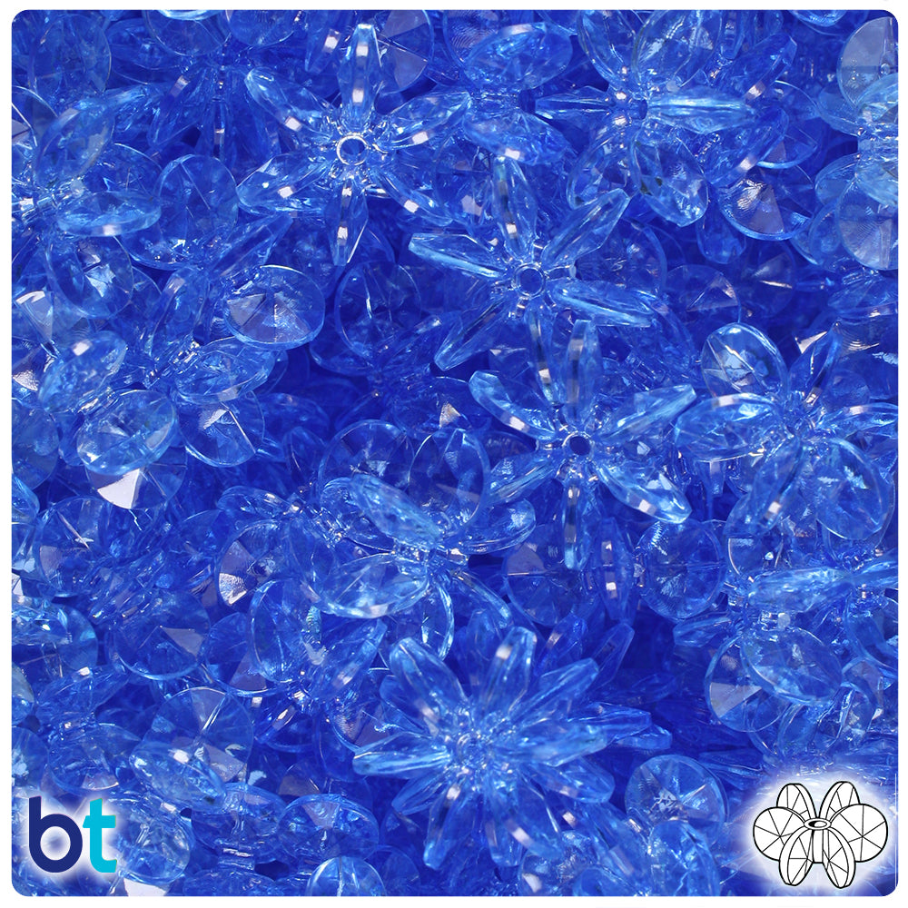 Our medium sapphire blue, in a see through transparent finish, sunburst plastic craft beads measure 18mm diameter and have a 1.5mm hole which runs through the center of the bead. SunBursts are also know as Paddle Wheel, Ferris Wheel, Star Flakes, StarBursts and Snowflake beads. These plastic craft beads are made in the USA with high-quality plastic and come in packs of approx. 135 beads. Craft Beads are ideal for making necklaces, bracelets, key chain and other jewelry projects, as well as holiday decorations, home bedazzling and many other craft ideas. They are also perfect for children's craft projects and church or activity camps. Craft Beads come with a small 1-2mm hole, so they will fit on a range of threading material like elastic cord, stretchy cord and jewelry wire.