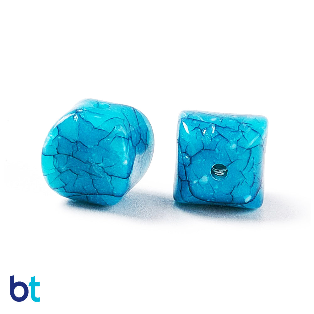 Our mixed colors crackle effect opaque finish puffed cube shaped plastic beads measure 11mm wide (hole to hole) by 10.2mm thick and have a 1.5mm hole in the center of the bead. This style of bead with the crackle effect is also known as an imitation turquoise bead due to the design. These plastic craft beads are imported from China and sold in packs of 56g (2oz), which is approx. 60 beads. Craft Beads are ideal for making necklaces, bracelets, key chain and other jewelry projects, as well as holiday decorations, home bedazzling and many other craft ideas.