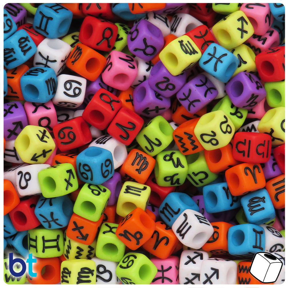 These mixed colored opaque cube shaped alphabet plastic beads measure 7mm high by 4mm wide and have a 4mm hole which runs horizontally to the signs which are imprinted on four sides of the beads in black. This pack contains a random mix of constellations and colors. These craft beads are imported from China and sold in packs of approx. 150 beads. Our alpha beads are perfect for personalizing necklaces, bracelets, key chains and all manner of kandi designs.