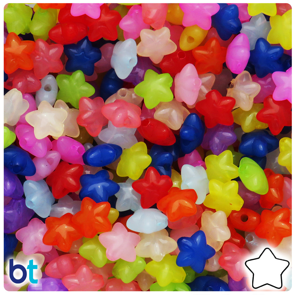 Our mixed colors semi translucent finish puffy star shaped plastic craft beads measure 10mm across by 6mm thick and have a 1mm hole that runs down the center of the bead. These beads are made of plastic/ acrylic and are imported from China and come in packs of approx. 125 beads. Craft Beads are ideal for making necklaces, bracelets, key chain and other jewelry projects, as well as holiday decorations, home bedazzling and many other craft ideas. They are also perfect for children's craft projects and church or activity camps. Craft Beads come with a smaller hole, so they will fit on a range of threading material like elastic cord, stretchy cord and jewelry wire.