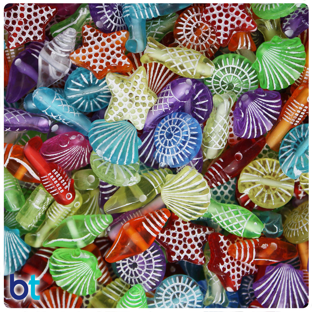 These mixed colors transparent sea life miniature mix plastic/acrylic craft beads measure approx. 10mm with a 1mm hole which runs through the center of the bead and features white details on the various shapes. Our acrylic craft beads are imported from China and come in packs of 50g which is approx 140 beads.